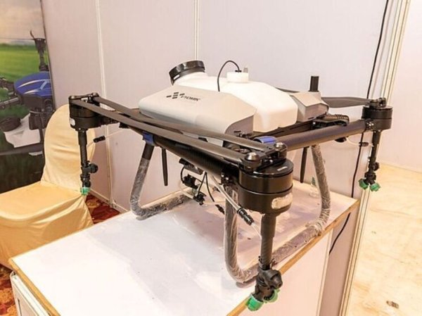 Изобретение состоит из площадки для вертикального взлета и посадки беспилотного летательного аппарата (БПЛА), камеры с насосом и нагнетательного трубопровода со встроенным перепускным клапаном и счетчиком расхода жидкости. При этом наконечник трубопровода вертикально установлен на ВПП (взлетно-посадочную полосу) мобильного заправщика. Кроме того, в корпусе устройства расположены емкость для хранения воды, мойка высокого давления, и зарядное устройство блоков питания. Приспособление предназначено для заправки агродронов, распыляющих инсектициды, гербициды, удобрения или жидкие противогололедные реагенты. На несущей раме устройства — как минимум одна колесная пара и приспособление для крепления к буксирующему транспортному средству. В баке используемого БПЛА, который крепится под днищем коптера, также есть контроллер расхода распыляемой жидкости и обратный клапан для стыковки .
