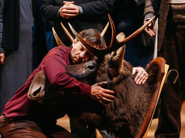 Федоров впервые ставит в Петербурге. Чувствуется по атмосфере в зале, что для публики все его фирменные приемы в диковину. Над сценой нависло ватное облако с подвешенными утками. На заднике — пугающие черные тени гигантских деревьев, колышущихся на ветру. В этот лес Зилов должен пойти на охоту, и никто не спросит, хочет ли он. Сценографом спектакля стал сам режиссер, как обычно.