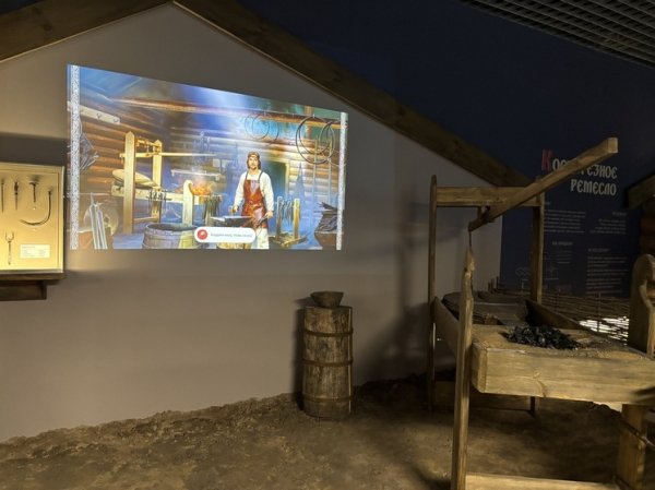 Не обошлось и без Иишки — технологий искусственного интеллекта. На стенде, посвященном кузнецу, размещен экран, где сгенерированный нейросетью кузнец ждет, когда его запустят в работу, своеобразной кнопкой «ВКЛ» служат меха, которые может раздуть любой желающий посетитель (к чуду техники тут же выстроилась очередь из взрослых). Пара движений — и искусственный кузнец на экране начинает свою работу.