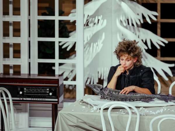 Полы белые, мебель белая. Сильная и безликая среда, эффектно созданная сценографом Николаем Симоновым. На контрасте с ней — черные костюмы персонажей. Чем-то все это напоминает мир Роберта Уилсона, но только визуально, без трагикомического внутреннего надлома. Скорее это реплика на тему «Алисы в Стране чудес», в киноверсии которой недавно снялась юная дочь Юлии Анка Пересильд. Звучат «Течет река Волга», другие хиты советских времен, народная песня «Ай повяжу я белый платок». Русское в европейском.