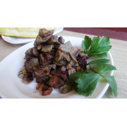 Принимаюсь за выжарки. Не большой кусочек хорошего сала, нарезаю тоже мелкими кубиками. Выкладываю на горячую сухую сковороду.