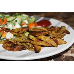 Осталось выложить картофельные дольки на противень и запечь в духовке до готовности. По времени это занимает примерно 30-40 минут, температура 180 градусов. Но все зависит от возможностей вашей духовки, поэтому проверяйте.