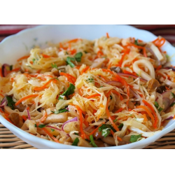 Способ приготовления: Быстрый и полезный зимний салат, продукты на который, обычно под рукой. Капусту мы покупаем самую обычную в Магните. А маш проращиваю зимой постоянно, вот, на фото целая пластиковая баночка в процессе.
