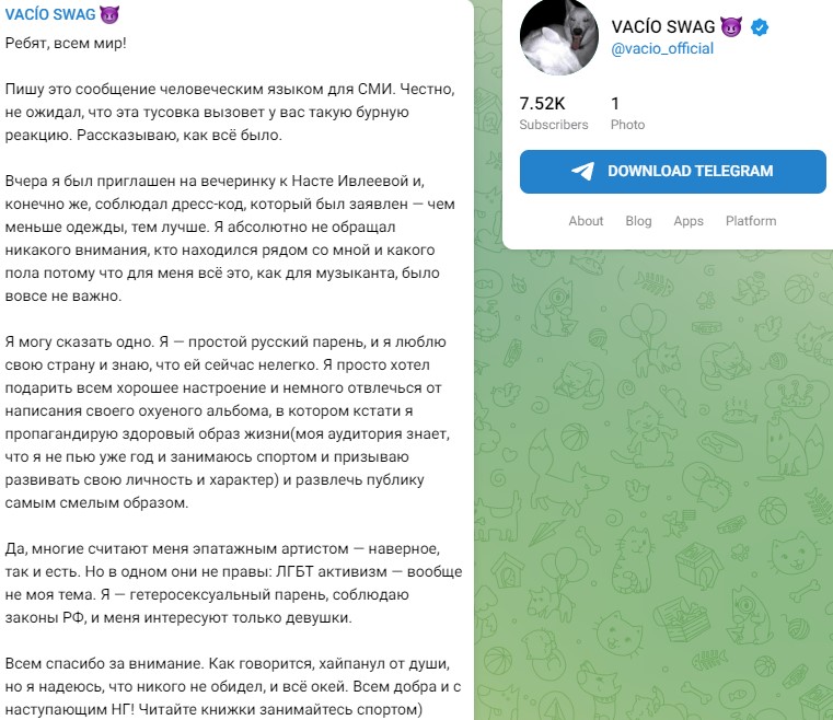 Напомним, на «голую» вечеринку Насти Ивлеевой Николай Васильев(настоящее имя Vacio) пришёл в одном носке, надетом на причинное место. В ходе мероприятия в отношении места с носком был произведён ряд манипуляций другими участниками и произошедшее попало на камеры присутствующих гостей. После этого поведением эпатажного музыканта заинтересовались представители правоохранительных органов. Рэпер поторопился объясниться за своё поведение, но его оправдательный пост особого впечатления ни на кого не произвёл.